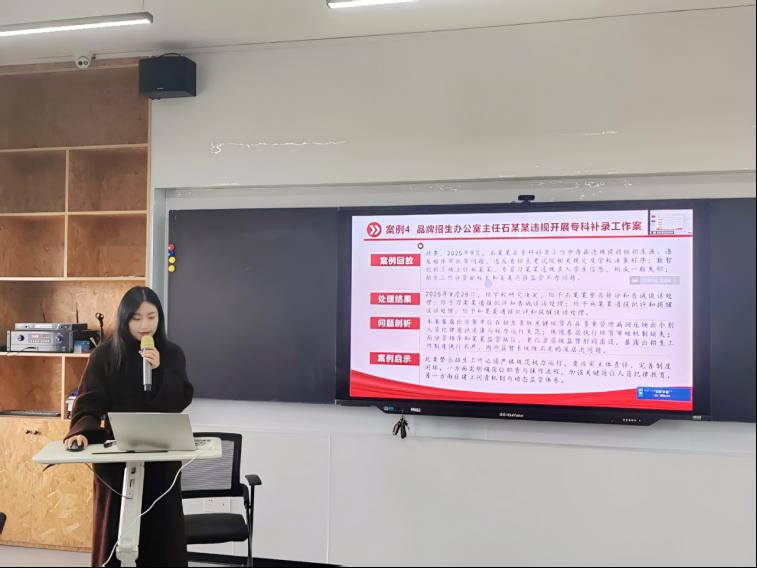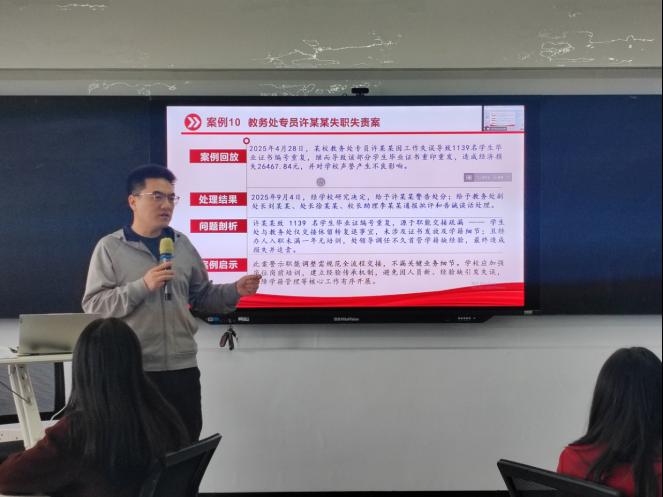 首先,胡天慧老师围绕“筑牢合规防线、严明纪律规矩”的核心主题,结合学校监事会2025年9月执纪监督与问责处理总体情况展开讲解。结合PPT中10个典型案例,从“违纪事实、处理结果、问题根源、警示意义”四个维度进行深度剖析,并聚焦与学院工作高度关联的案例重点解读。