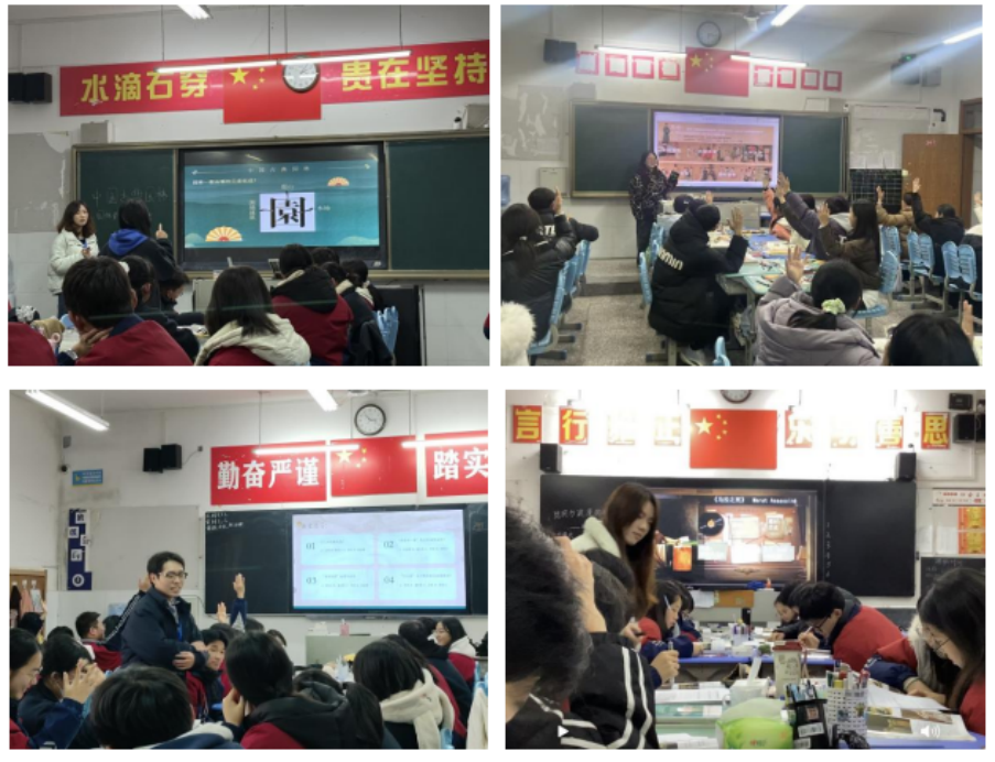 听课环节中,恩施市第二中学美术教研组组长杨蕾、美术教师谭怡航、谭君宇与我校美术系教师朱慧深入实习生执教的美术课堂,重点围绕SC教学改革核心要求,细致观察教学目标设定、学生主体参与度、互动任务设计等关键维度。从色彩静物写生到创意设计实践,从传统美术鉴赏到现代新媒体艺术教学,实习生们将高校所学教学理论与中学教学实际相结合,通过设计自主探究任务、小组合作创作、个性化作品点评等形式,充分调动学生参与积极性,课堂氛围活跃且富有张力,展现了扎实的美术专业素养与践行SC教学改革的潜质。
