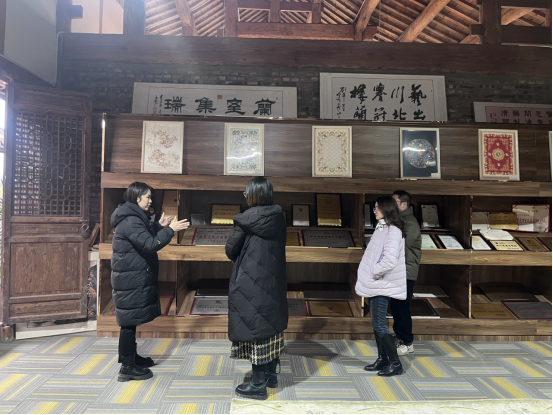调研活动分时段有序推进。上午,调研组一行深入农场桑园种植区、蚕桑文化体验园、田间直播间等核心区域,实地察看农场生态农业运营模式与文旅项目建设现状。在座谈交流环节,农场负责人卢柏沄与老师们围坐一堂,展开深度交流。卢柏沄详细介绍了农场在艺术乡建背景下的发展规划,重点阐述了当前农场在农场景观升级、文创产品设计、非遗体验空间打造等方面的人才缺口。老师们则结合环境设计专业的课程设置与人才培养方向,解读了高校在景观规划、空间设计、文化转化等领域的教学优势。双方聚焦人才技能需求清单,就专业人才培养、实践项目合作等内容交换意见,力求实现校企资源互补、协同发展的双赢效果。下午,卢柏沄带领老师团队开启了一场沉浸式的非遗文化体验之旅。调研组先后走访了当地的蚕丝地毯作坊、刺绣工作室、扎染手作空间,近距离观摩蚕丝地毯的经纬编织、刺绣纹样的精细勾勒、扎染布料的浸染固色等非遗技艺流程。在传承人的指导下,老师们还亲手参与扎染图案设计与制作,亲身感受元坝本土蚕桑文化与传统手工艺的独特魅力。这场非遗体验让调研组直观地了解到本土文化资源的价值,为后续环境设计专业如何将非遗元素融入乡村景观与文创设计,提供了鲜活的实践素材。